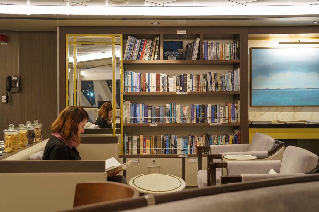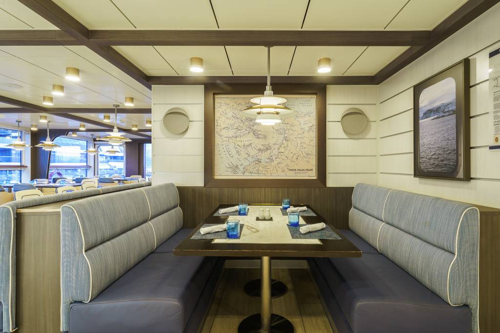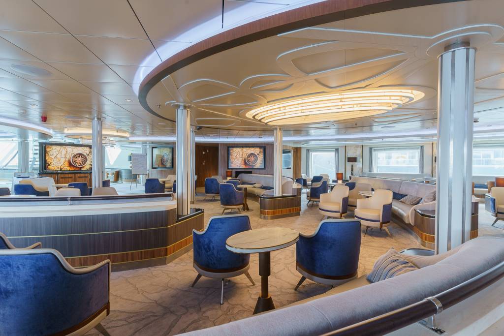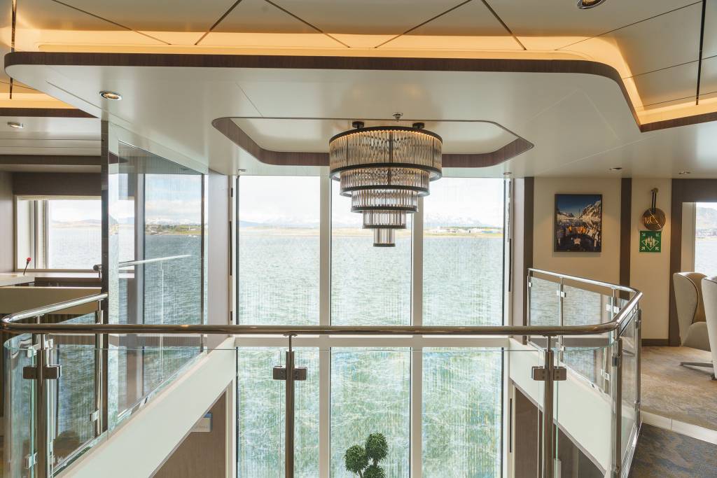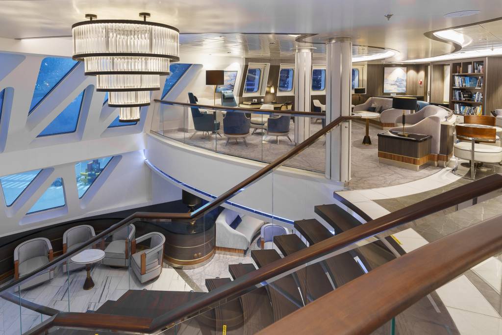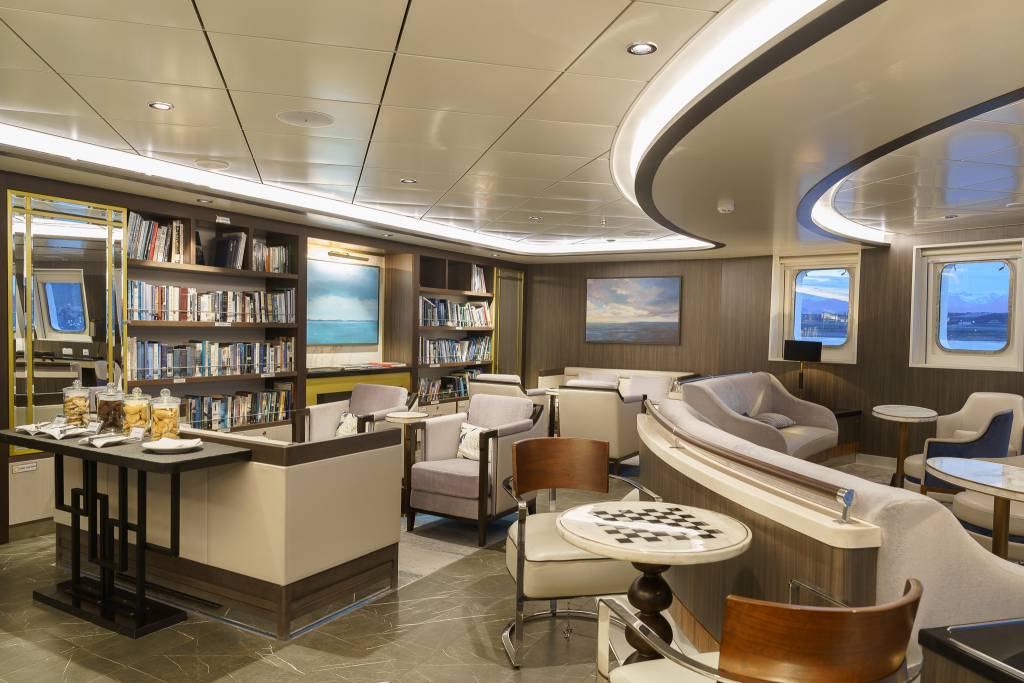 Ocean Explorer is modern, elegant and purpose-built for polar exploration. The 138-passenger vessel has been designed with the latest in expedition ship technology. One of the ship’s key features is the ULSTEIN X-BOW®, a marine engineering innovation that ensures a comfortable and smooth sailing experience thanks to the inverted bow. Located at the bow is the two-story, light-filled library, which introduces a welcome airiness to the expedition ship.