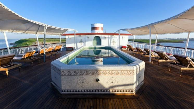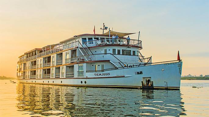The Jahan is a Mekong River cruise vessel inspired by the grandeur of British India. Its staterooms have private balconies, while the Noble Suites have lavish interiors, dual balconies, and even a private Jacuzzi. The ship’s design blends colonial charm with modern indulgence, ensuring a refined yet comfortable stay. With a variety of accommodation options, from Superior Staterooms to expansive suites, The Jahan offers a truly regal experience.