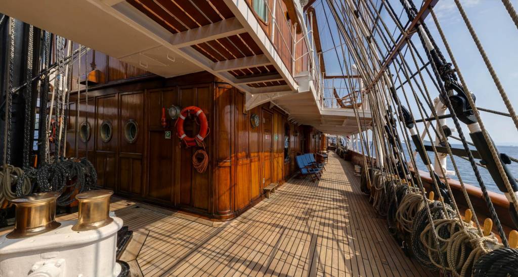 We therefore take every opportunity to set sail and be propelled by the sheer power of the wind. That is why the captain will sometimes change the route if the weather requires it. On board our SEA CLOUD tall ships, you’ll experience the elements, as many of the day-to-day activities take place outside.