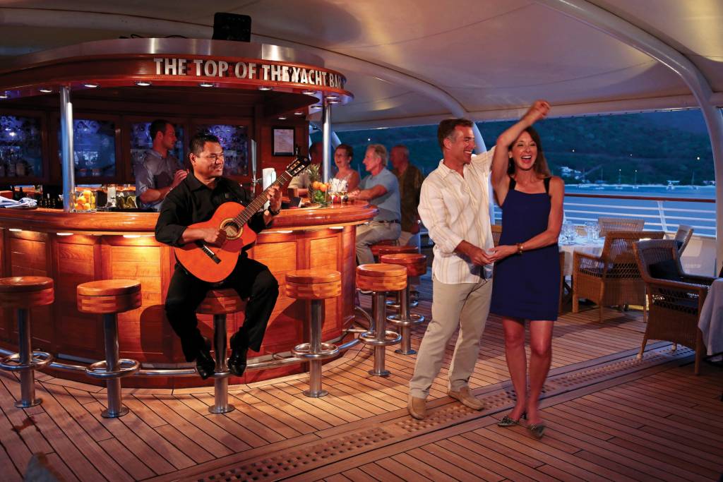 Music and a lively social atmosphere fills the yacht by night. Enjoy your favorite after dinner cocktail and request a tune at the Piano Bar. Visit the Top of the Yacht Bar for breathtaking night views and mingle with new friends, or try your luck at the Casino on Deck 4. The night is waiting for you on SeaDream.