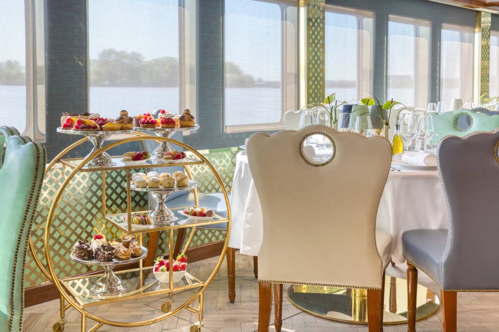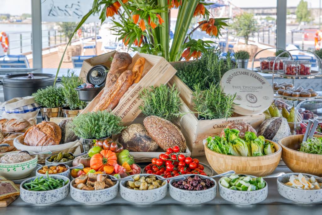 The stunning Soleil Deck, awash in vibrant fabrics, features the only infinity pool on the rivers and spectacular views of the French countryside. Poolside service at Le Café du Soleil offers casual French cuisine as well as open-air cooking demonstrations from our chefs.