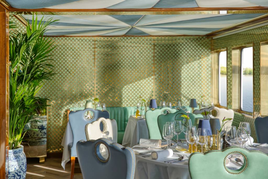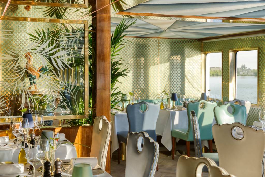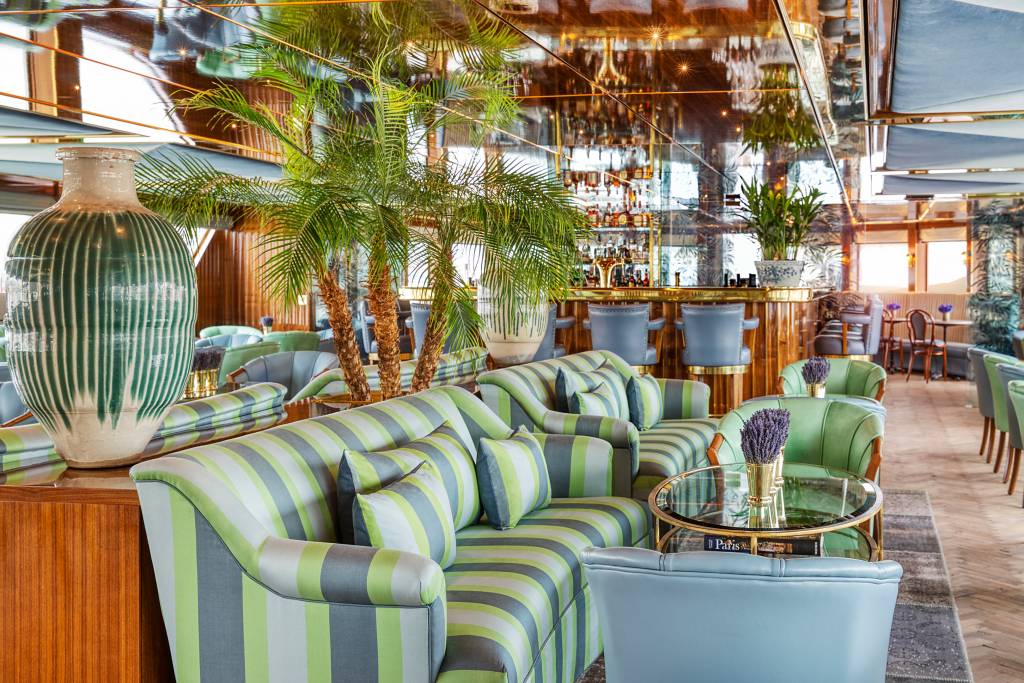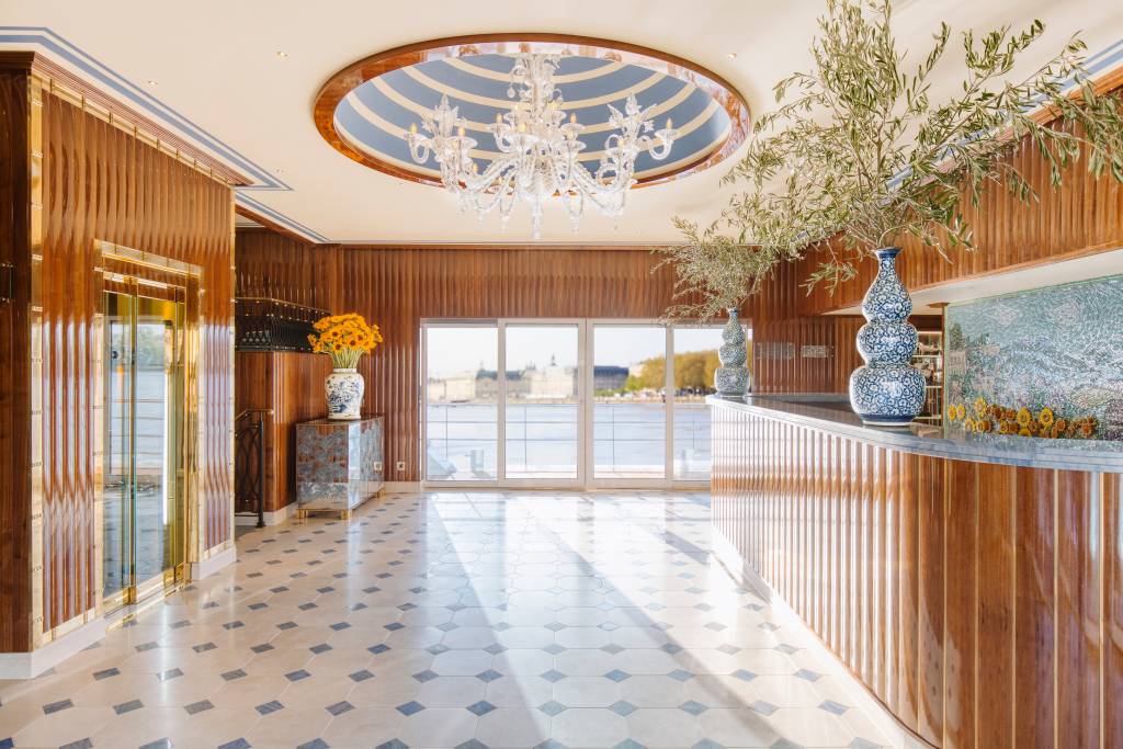 The S.S. Bon Voyage is designed to immerse guests in French culture, art, and wine, starting with its stunning grand entrance—a signature Super ShipTM element—clad in polished wood, subtle brass details, and hand-crafted balustrade.